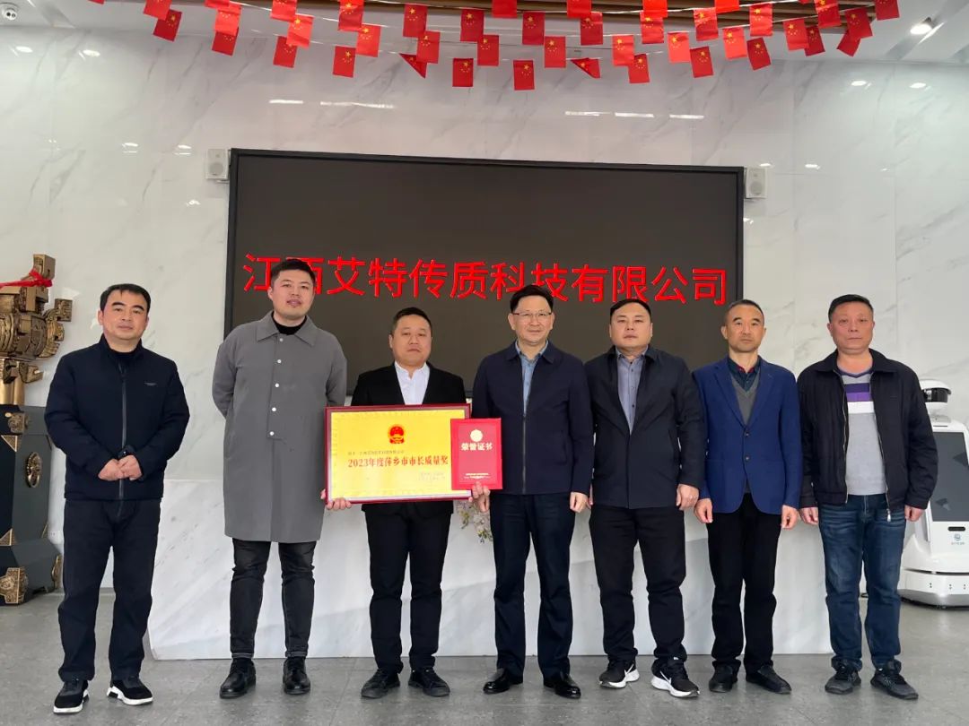 12月7日,市質量強市領導小組辦公室主任、市市場監(jiān)管局黨組書記、局長劉曉峰,副局長黃漢弘一行蒞臨江西艾特傳質科技有限公司,為我司頒發(fā)了“2023年度市長質量獎”獎牌和證書。